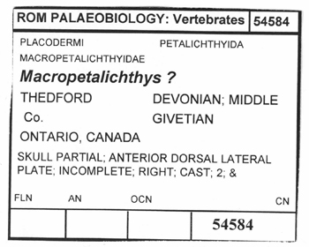 After cleaning, each fossil has its unique specimen number marked onto the fossil (or the fossil's box if the fossil is small). I use waterproof, permanent, black india ink and write with a fine point mapmaker's "dip nib" pen. You can (and should) write tiny numbers with that pen. Many professionals use a Rapidograph fine point draughman's mechanical pen, but I find they keep clogging because I don't use it frequently enough. Some items require a tiny dab of white paint (or typewriter "whiteout") to provide a non-porous, contrasting background for the ink.
